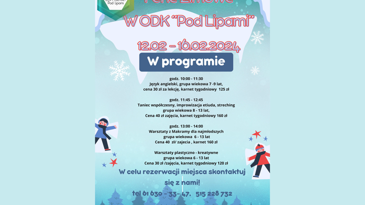W poniedziałek 12 lutego w Wielkopolsce rozpoczynają się zimowe ferie. Dom kultury „Pod Lipami” przygotował dla dzieci i młodzieży kilka ciekawych propozycji spędzenia tego czasu.