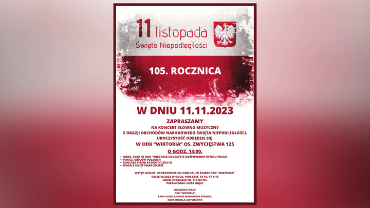 ODK "Wiktoria" i samorządowcy z Rady os. Nowe Winogrady Północ zapraszają na spotkanie patriotyczne. Wydarzenie będzie miało miejsce 11 listopada o godz. 17.