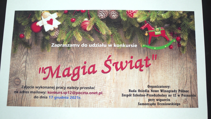 Przypominamy o konkursie plastycznym organizowanym przez Zespół Szkolno-Przedszkolnym nr 12 oraz Radę osiedla Nowe Winogrady Północ. Prace na konkurs zatytułowany „Magia Świąt” należy przesyłać do 17 grudnia.